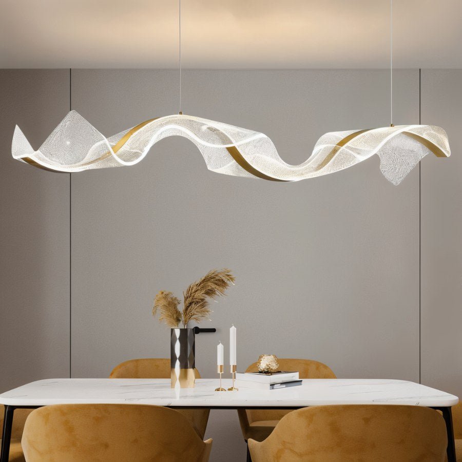 This chandelier is modern elegant and totally unique. The wavy design with gold accents makes it a true statement piece. The soft glow creates the perfect ambiance making my living space feel luxurious.