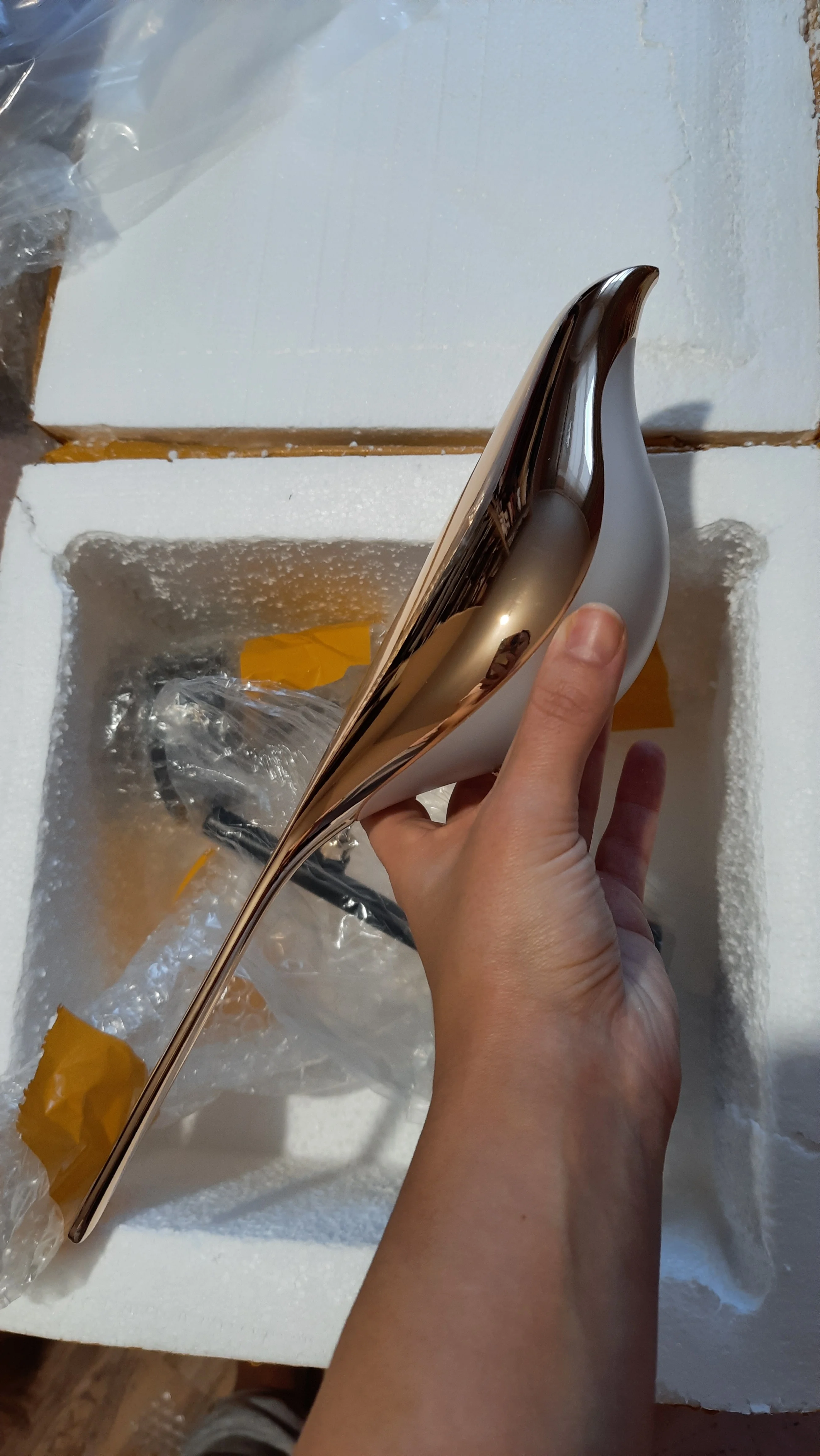 Well, what can I say. Unexpectedly. Chrome Super quality. Heavy, metal, the chrome coating is good without defects, all the parts are well fitted, there is no play, the bird is spinning on the 360. Good certified converter. Shorter quality is excellent. Everything works. Took a warm one as a night light, did not stay good. All relatives now ask to order the same, I recommend. Packed perfectly, the Mail of Russia survived without damage, delivery to the Irkutsk region a little more than 2 weeks