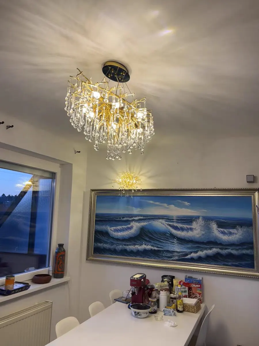 Revel in its high-quality crystal accents, creating mesmerizing light reflections that dance across your walls. The sleek water-drop silhouette, finished in luxurious gold, adds a touch of opulence to your decor.