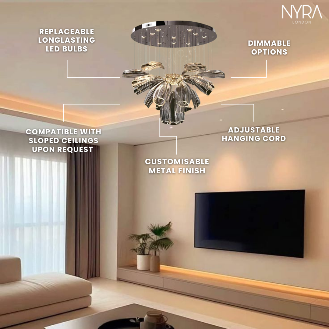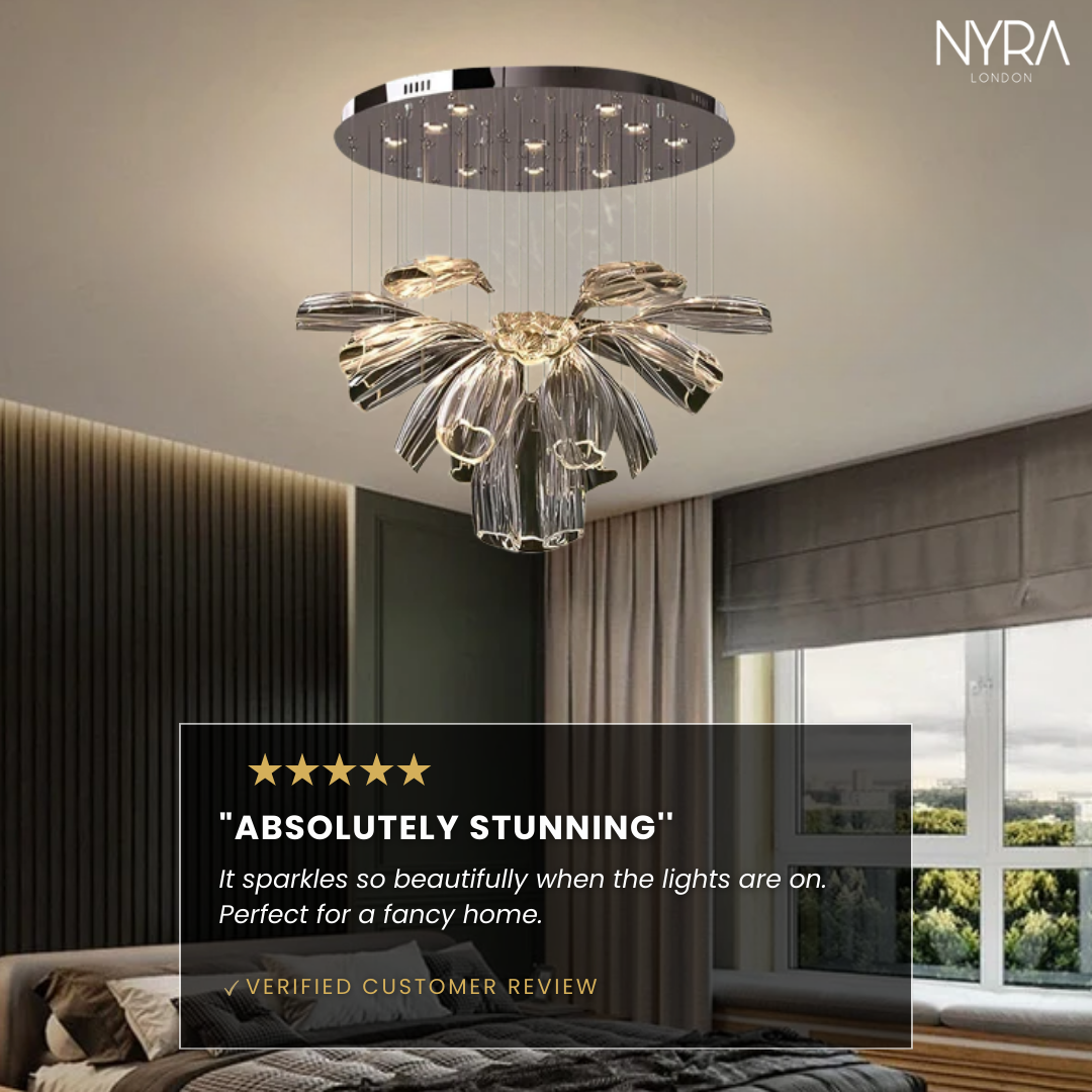 The Roma Crystal Pendant redefines elegance with its unique flower-inspired crystal design and polished metal finish. This luxurious lighting fixture is perfect for dining rooms, bedrooms, or upscale living spaces. Its adjustable suspension wire allows for customization, ensuring a flawless fit in any room.