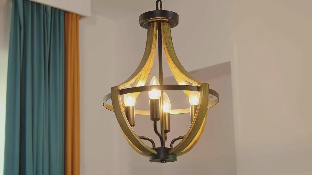 This chandelier brings a classic farmhouse charm to my dining area. The wood details add warmth and rustic elegance.